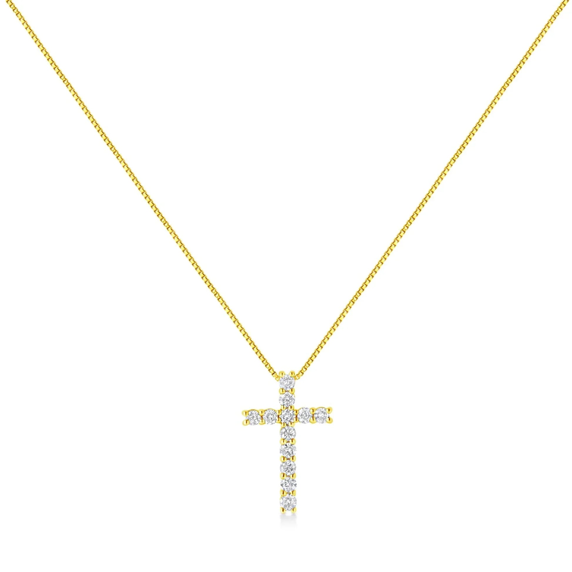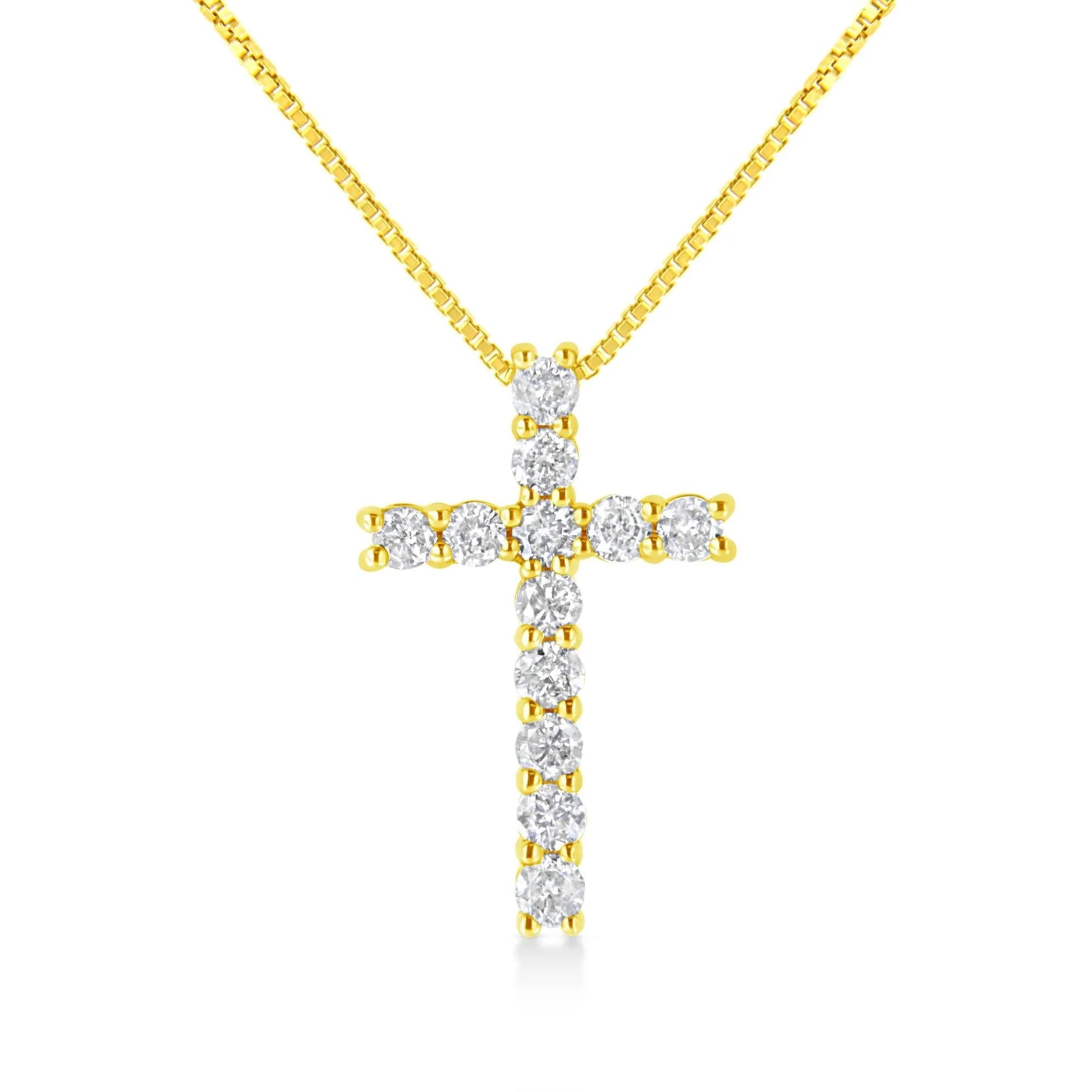 Introducing the perfect solution: a stunning 10K yellow gold pendant necklace featuring a 1/2 carat total weight round brilliant cut diamond cross on an 18" gold box chain. This fine jewelry piece embodies both sophistication and spiritual meaning, designed to uplift and illuminate your daily journey.