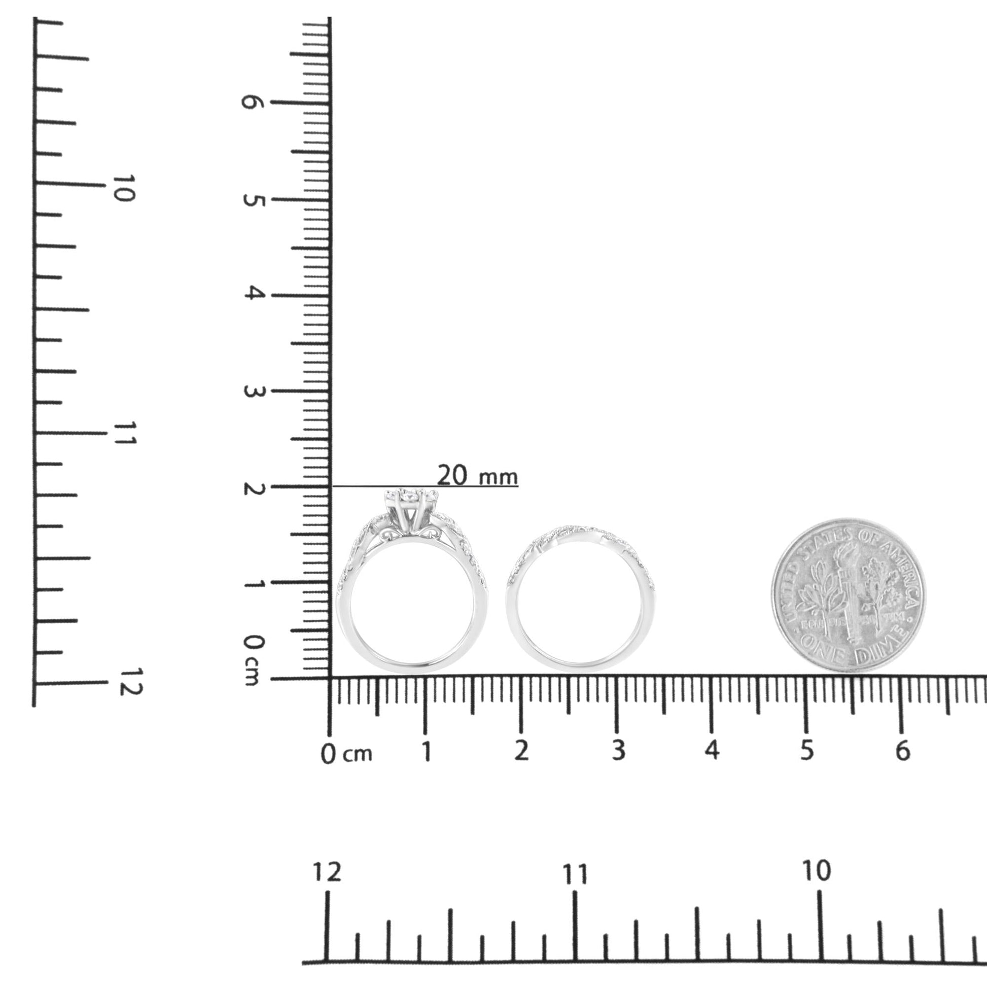 This gorgeous 1 ct tdw engagement ring and band set is brilliantly designed with braided silver bands and a central floral diamond cluster. The entire piece is set in the finest .925 sterling silver, and embellished with lab grown diamonds. The diamonds are ethical and sustainable, so you can feel good about this purchase on your big day!